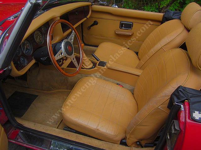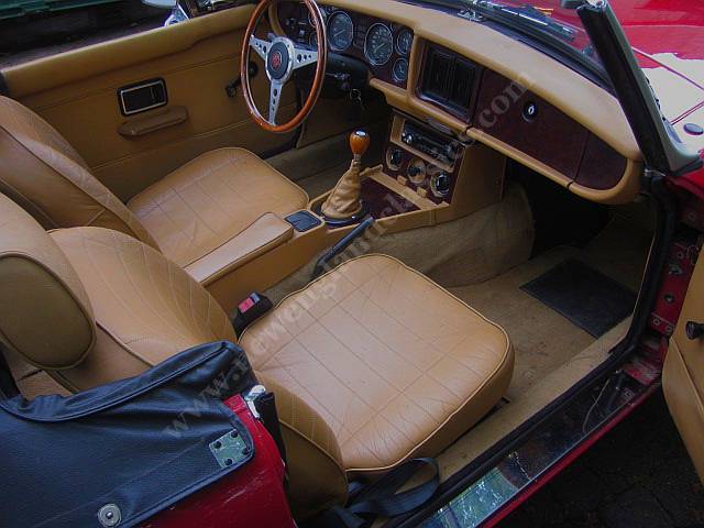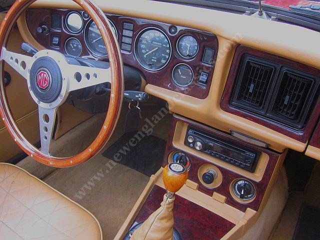 But on this car we went further...note the custom dying of the dash surround, console, etc. so that it all matches. And with leather seats, modern stereo, new top and tonneau, carpeted trunk, and wire wheels with 185/70 radials, this is one fabulous MGB.
